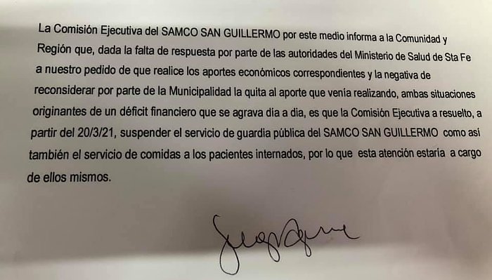 La determinación se conoció a partir de un comunicado dado por la entidad en las últimas horas. Es otra muestra de la dificil situación económica que atraviesa la institución. Aduce falta de apoyo del Ministerio de Salud provincial y el recorte de fondos que dispuso el municipio